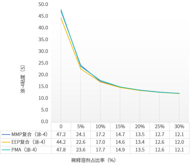 分别以EEP、MMP、PMA的复合溶剂,按占比5%、10%、15%、20%、25%、30%的比例溶解天冬聚脲涂料(A组份),测得粘度变化曲线,从而分析复合溶剂对天冬聚脲涂料的溶解力。(注:由于评估体系为油漆,故粘度采用24℃~25℃的涂-4粘度)